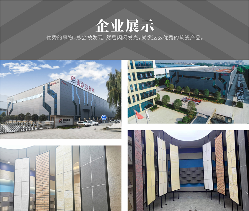 寶潤(rùn)達(dá)外墻軟瓷磚:具有安全環(huán)保、抗震防裂、耐火防凍、拒水透氣、耐酸耐堿等優(yōu)良特性,表現(xiàn)力豐富,是良好的室內(nèi)外建筑飾面材料