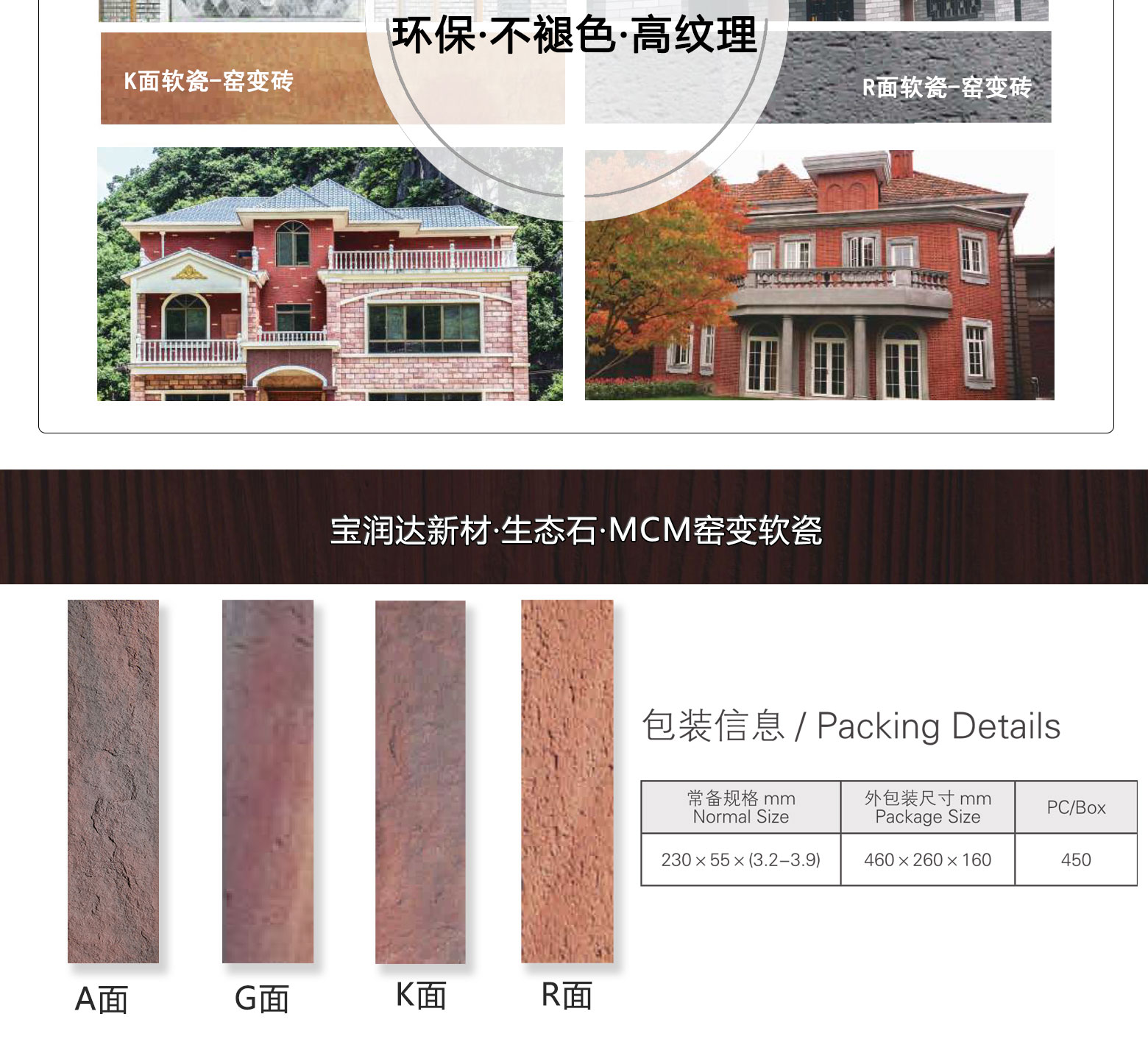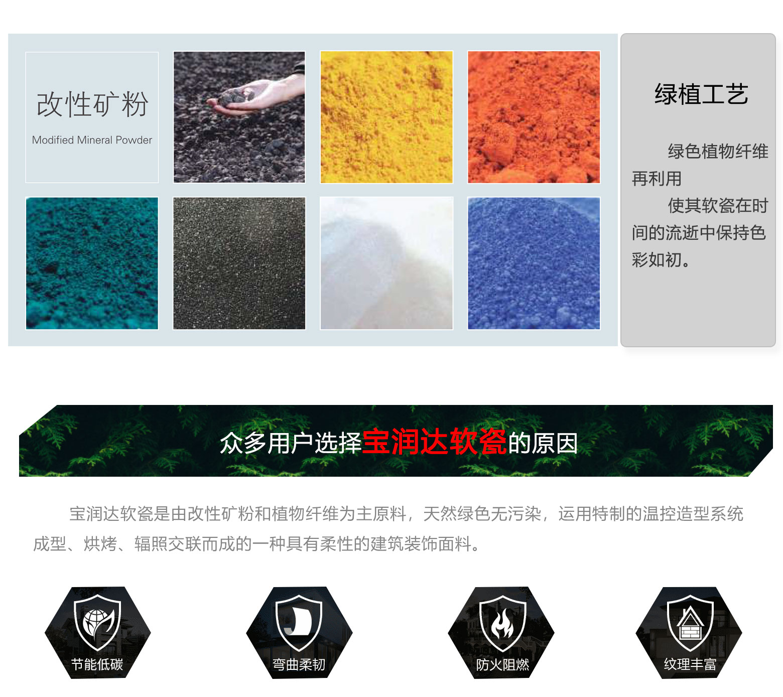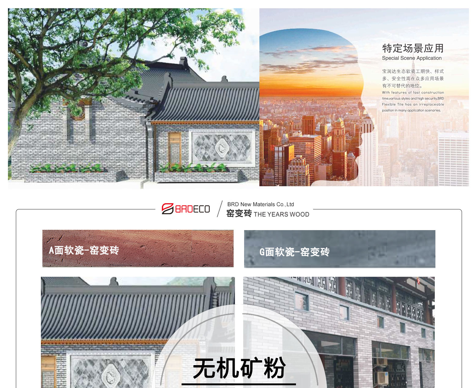 寶潤達外墻軟瓷磚:具有安全環(huán)保、抗震防裂、耐火防凍、拒水透氣、耐酸耐堿等優(yōu)良特性,表現(xiàn)力豐富,是良好的室內外建筑飾面材料