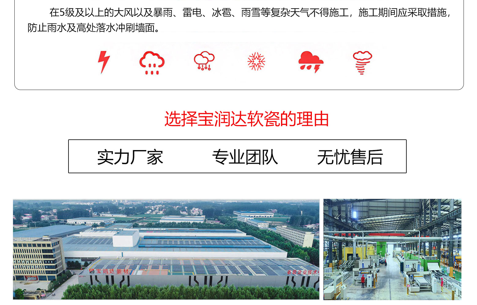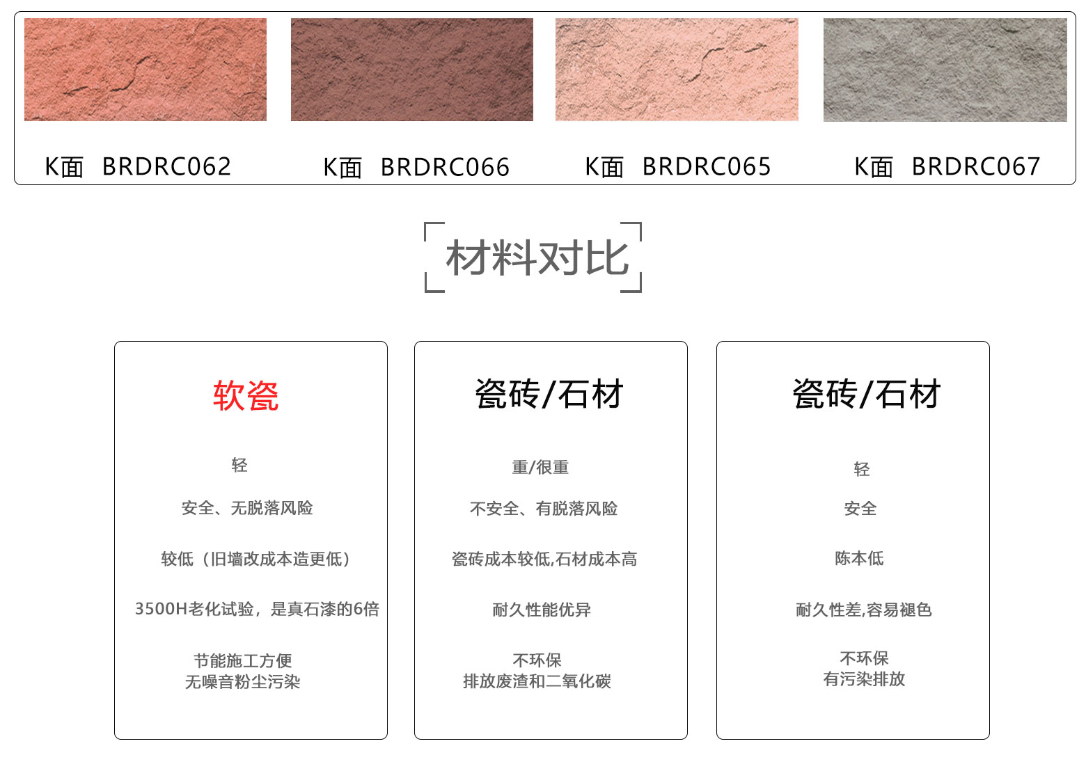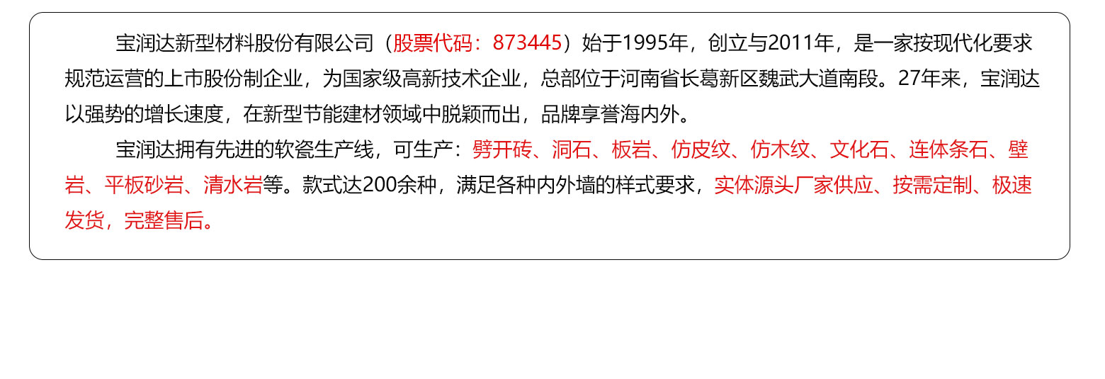 寶潤達外墻軟瓷磚:具有安全環(huán)保、抗震防裂、耐火防凍、拒水透氣、耐酸耐堿等優(yōu)良特性,表現(xiàn)力豐富,是良好的室內外建筑飾面材料
