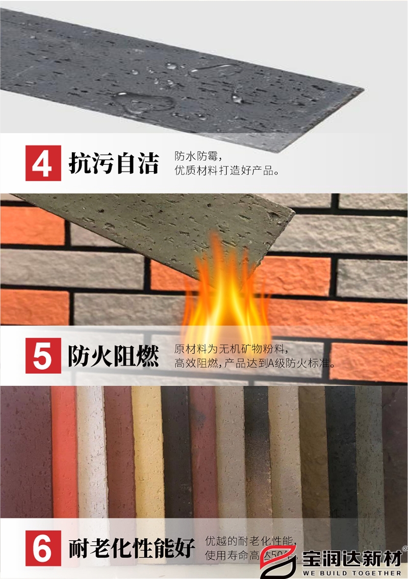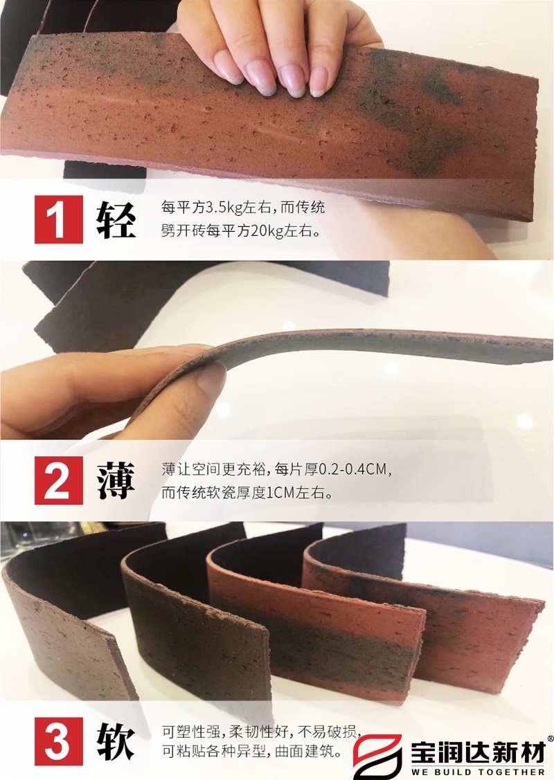 寶潤(rùn)達(dá)軟瓷成分為無(wú)機(jī)材料,顏色來(lái)自材料本身,都為純天然色彩,顏色自然持久,不會(huì)因紫外線照射或其他外界自然條件而出現(xiàn)褪色。產(chǎn)品本身也不會(huì)出現(xiàn)起鼓、脫落、粉化等老化現(xiàn)象,有著優(yōu)秀的耐久性能,可以通過(guò)國(guó)家相關(guān)檢測(cè)中心2300h的耐候?qū)嶒?yàn),遠(yuǎn)遠(yuǎn)高于國(guó)家行業(yè)標(biāo)準(zhǔn)柔性飾面磚所規(guī)定的。寶潤(rùn)達(dá)軟瓷樣式齊全,種類多樣,可仿多種精美面材。